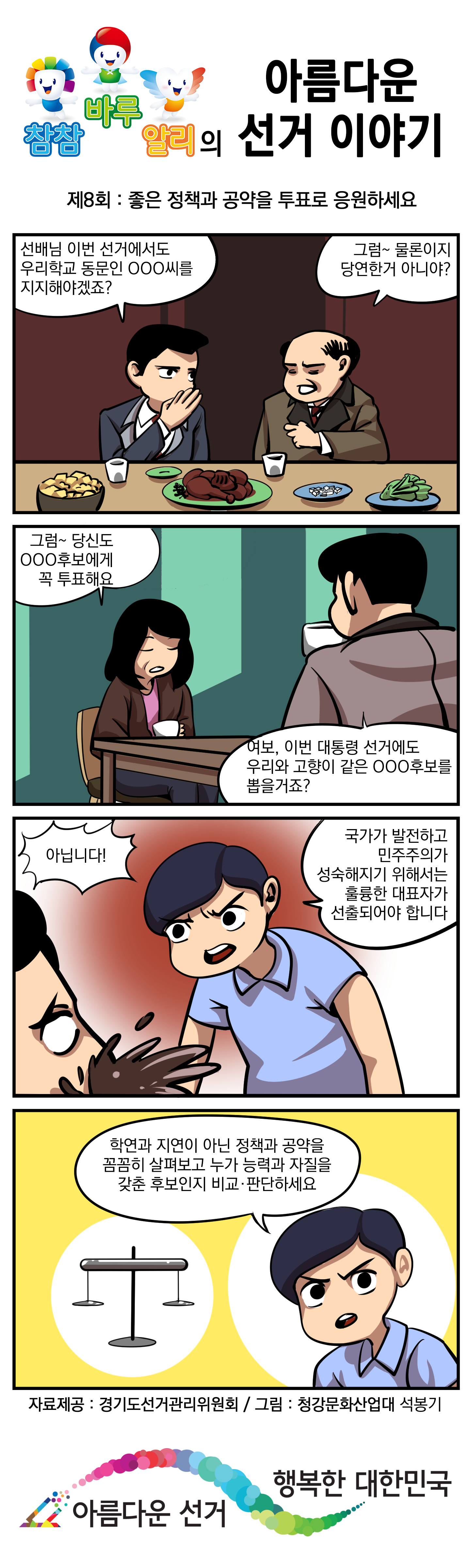 학연과 지연이 아닌 정책과 공약을 꼼꼼히 살펴보고 누가 능력과 자질을 갖춘 후보인지 비교, 판단하세요
