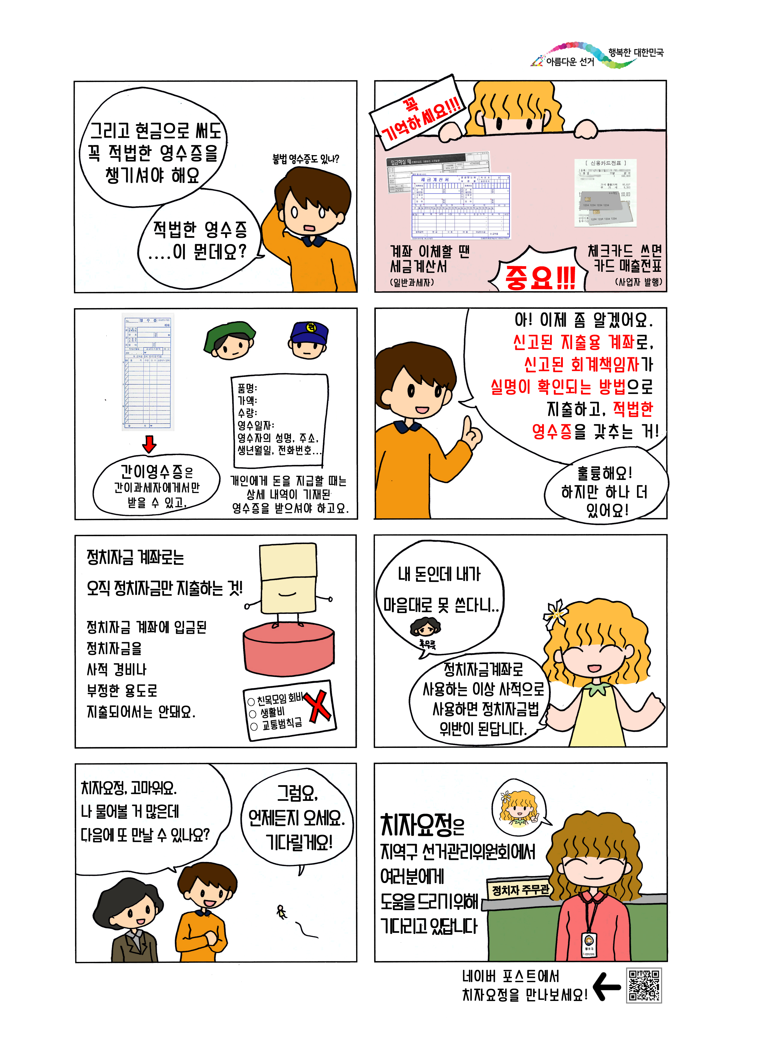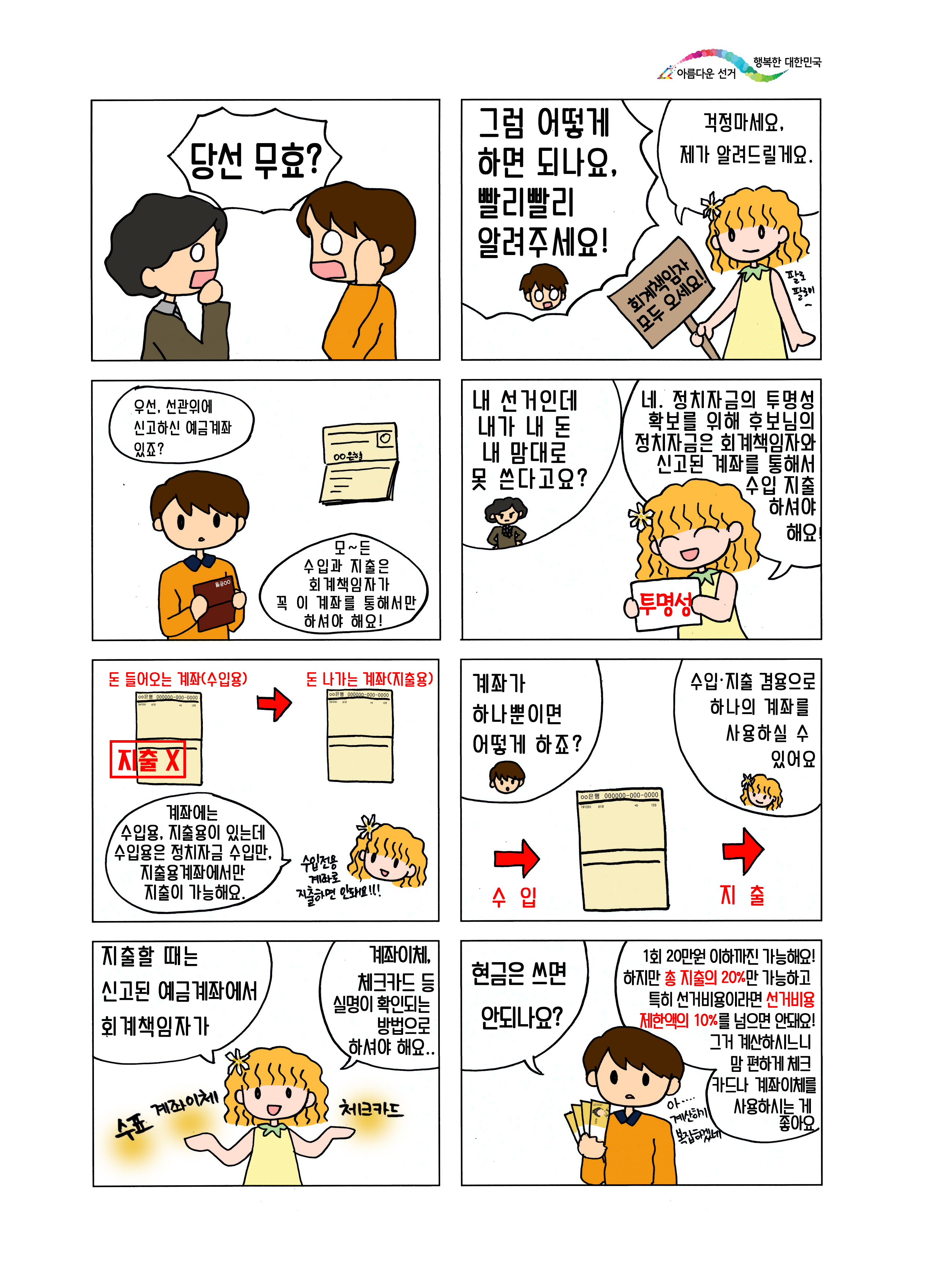 치:네. 정치자금의 투명성 확보를 위해 후보님의 모든 정치자금은 회계책임자와 신고된 계좌를 통해서 수입 지출하셔야 해요!