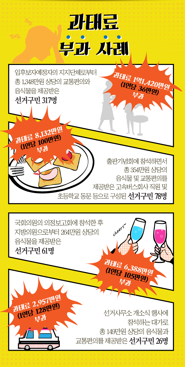 입후보자예정자의 지지단체로부터 총 1.348만원 상당의 교통편의와 음식물을 제공받은 선거구민 317명 - (과태료 1억 1,420만원 1인당 36만원 부과)