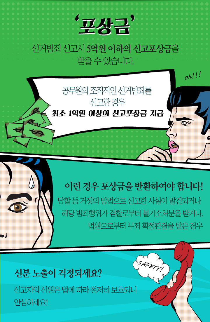 선거범죄 신고시 5억원 이하의 신고포상금을 받을 수 있습니다.