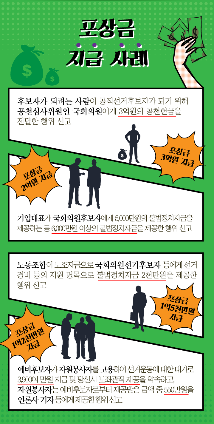 기업대표가 국회의원후보자에게 5,000만원의 불법정치자금을 제공하는 등 6,000만원 이상의 불법정치자금을 제공한 행위 신고 - 포상금 2억원 지급