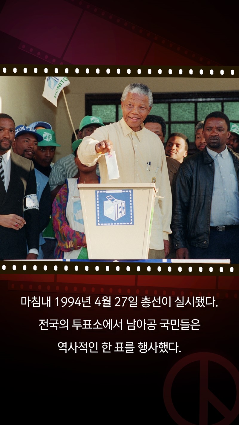 마침내 1994년 4월 27일 총선이 실시됐다. 전국의 투표소에서 남아공 국민들은 역사적인 한 표를 행사했다.