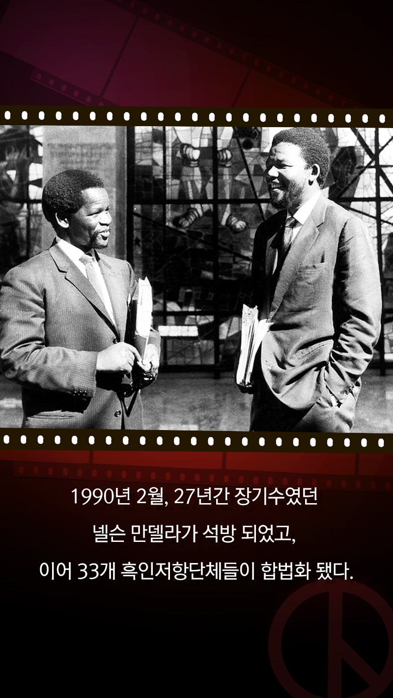 1990년 2월, 27년간 장기수였던 넬슨 만델라가 석방 되었고, 이어 33개 흑인 저항단체들이 합법화 됐다.