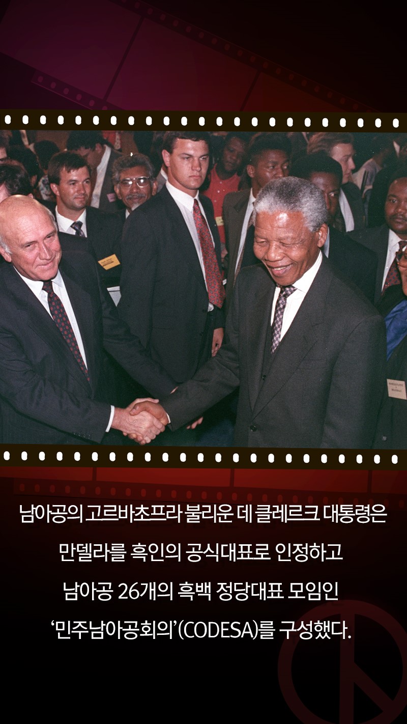 남아공의 고르바초프라 불리운 데 클레르크 대통령은 만델라를 흑인의 공식대표로 인정하고 남아공 26개의 흑백 정당대표 모임인 민주남아공회의(CODESA)로 구성했다.