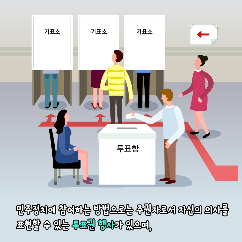 민주정치에 참여하는 방법으로는 주권자로서 자신의 의사를 표현할 수 있는 투표권 행사가 있으며,