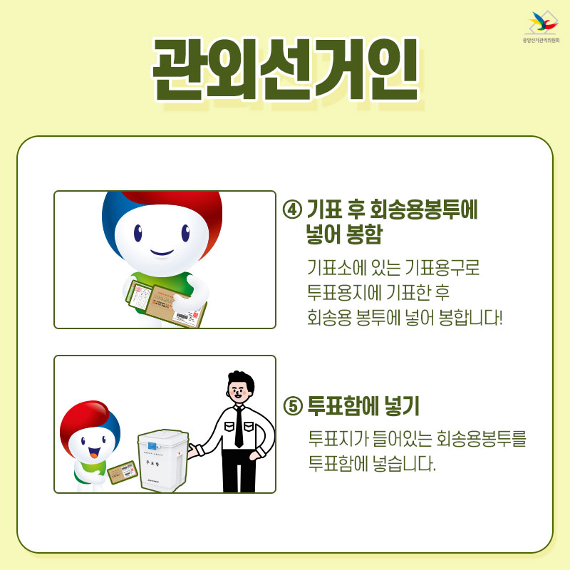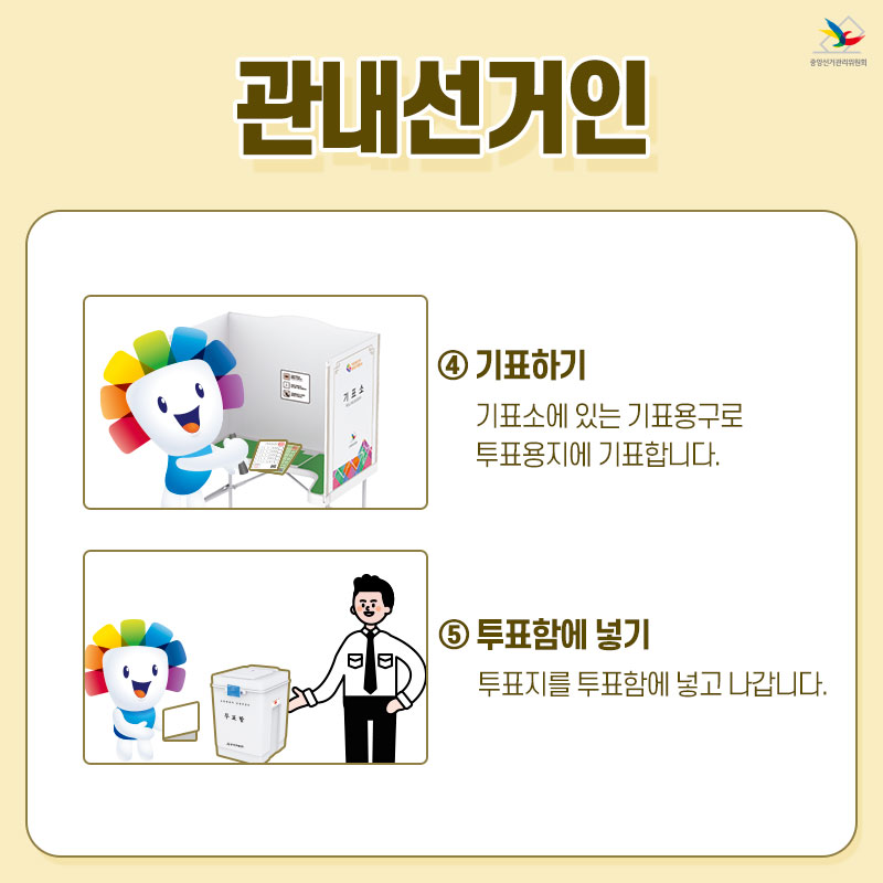 ⑤투표함에 넣기 투표지를 투표함에 넣고 나갑니다.