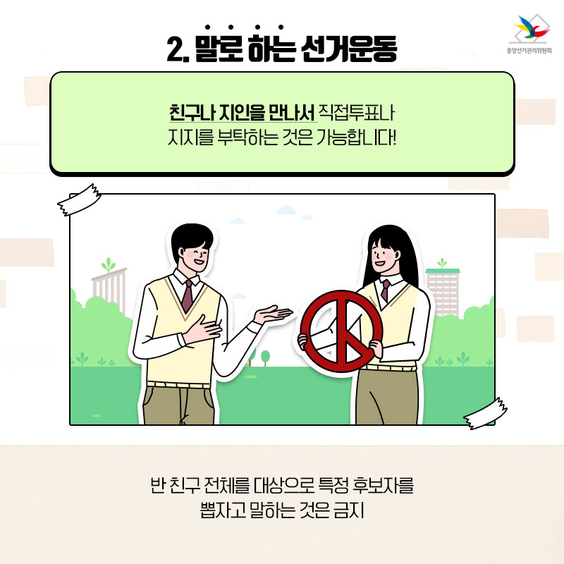 반 친구 전체를 대상으로 특정 후보자를 뽑자고 말하는 것은 금지