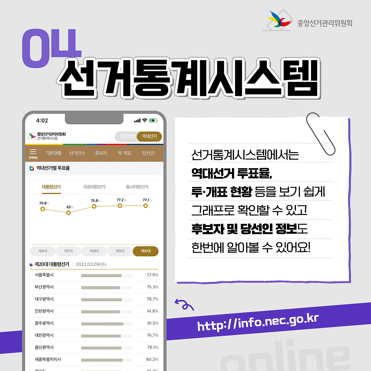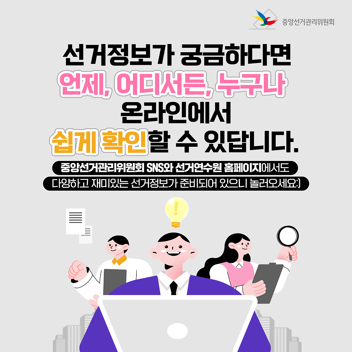 선거정보가 궁금하다면 언제, 어디서든, 누구나 온라인에서 쉽게 확인할 수 있답니다.