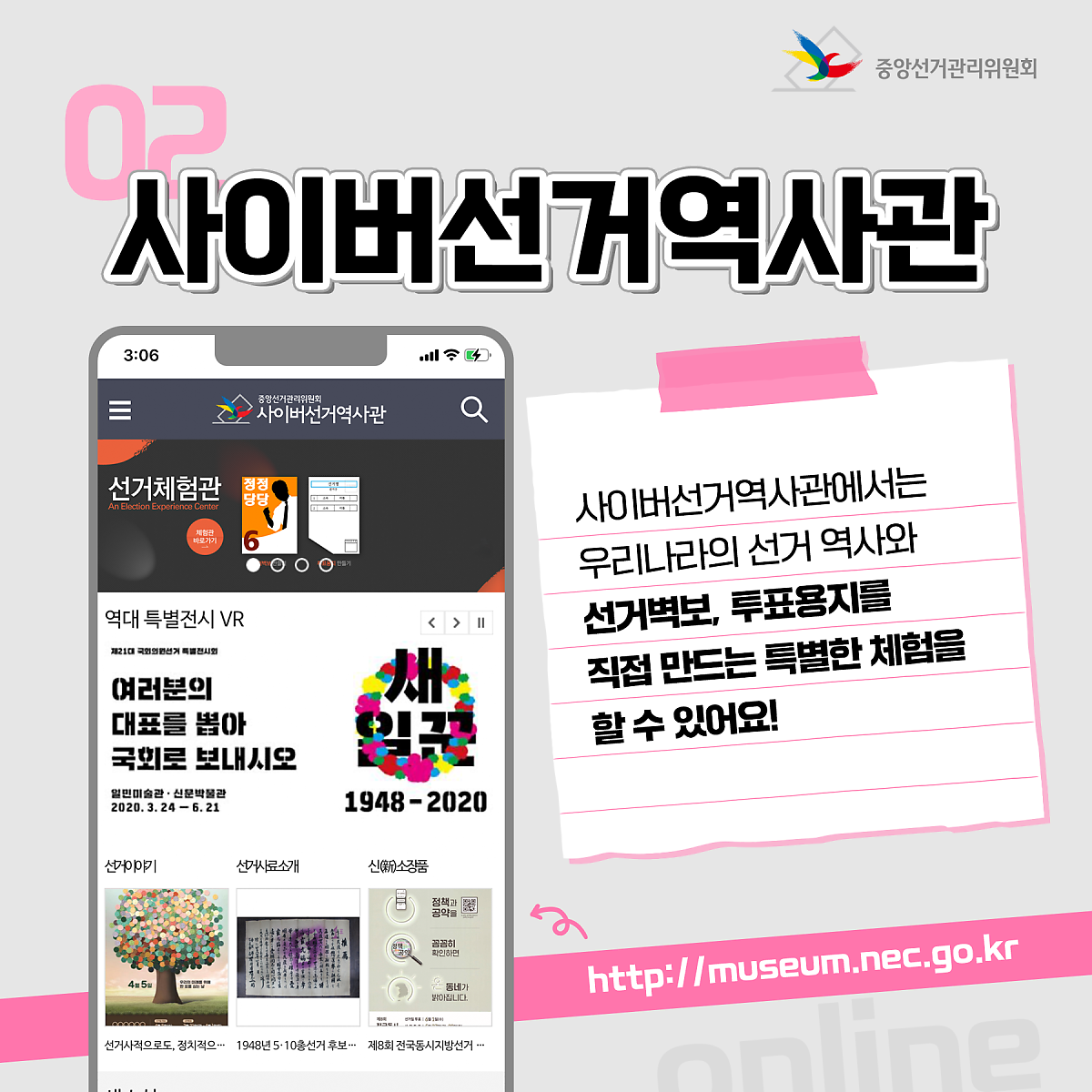 사이버선거역사관에서는 우리나라의 선거 역사와 선거벽보, 투표용지를 직접 만드는 특별한 체험을 할 수 있어요!