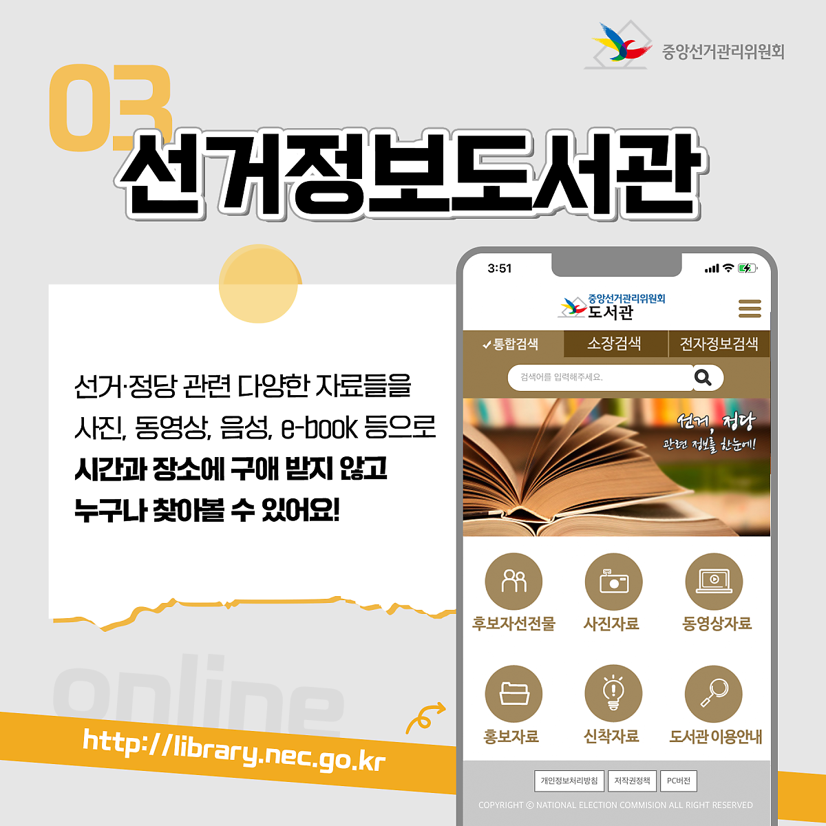 선거·정당 관련 다양한 자료들을 사진, 동영상, 음성, e-book 등으로 시간과 장소에 구애 받지 않고 누구나 찾아볼 수 있어요!