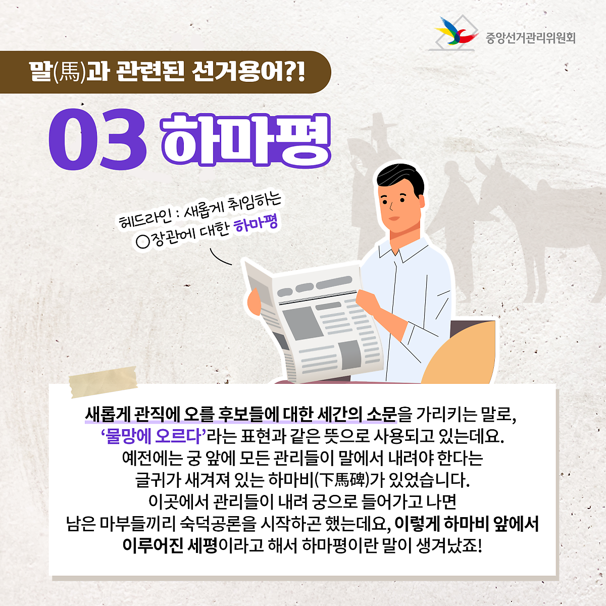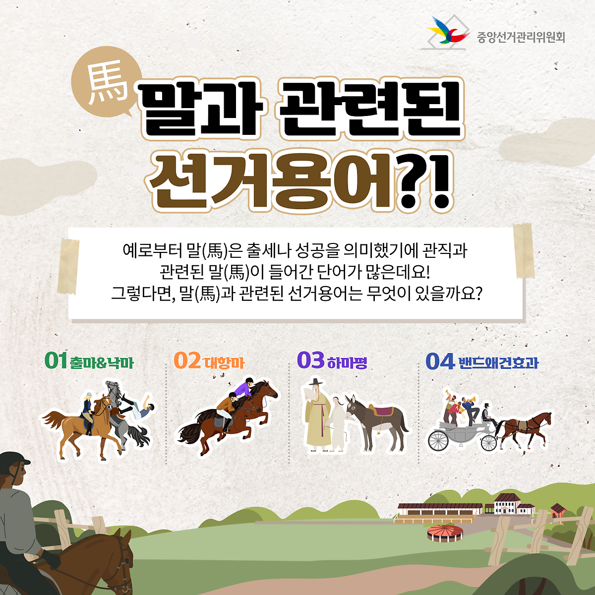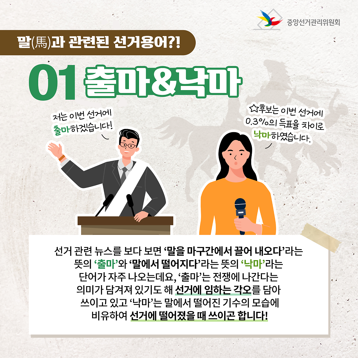 선거 관련 뉴스를 보다 보면 '말을 마구간에서 끌어 내오다'라는 뜻의 ‘출마’ 와 '말에서 떨어지다'라는 뜻의 ‘낙마‘라는 단어가 자주 나오는데요,