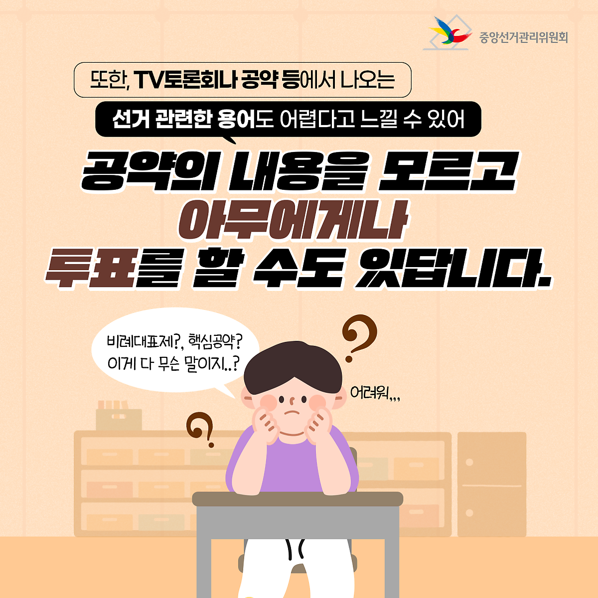 또한, TV토론회나 공약 등에서 나오는 선거 관련한 용어도 어렵다고 느낄 수 있어 공약의 내용을 모르고 아무에게나 투표를 할 수도 있답니다.
