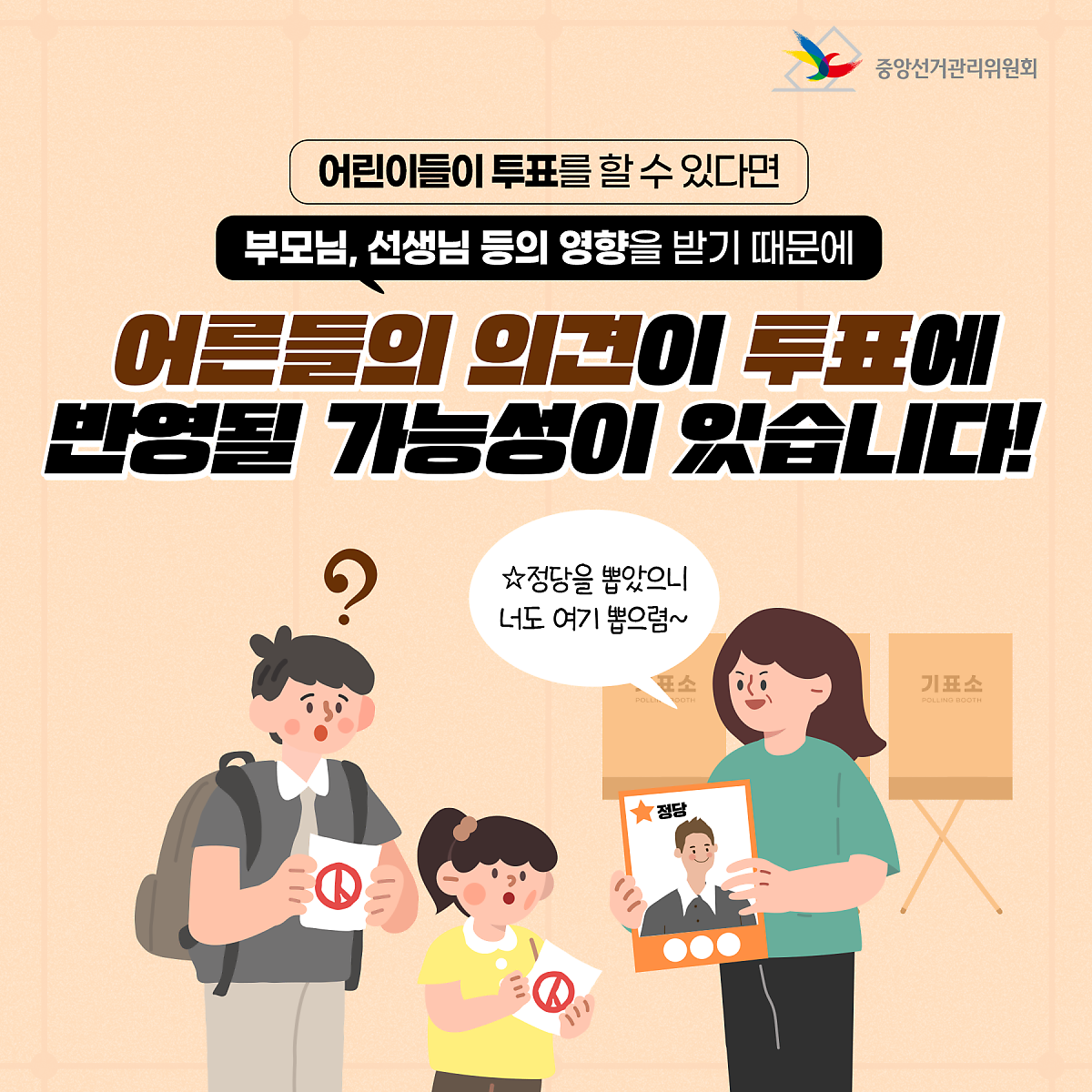 어린이들이 투표를 할 수 있다면 부모님, 선생님 등의 영향을 받기 때문에 어른들의 의견이 투표에 반영될 가능성이 있습니다!