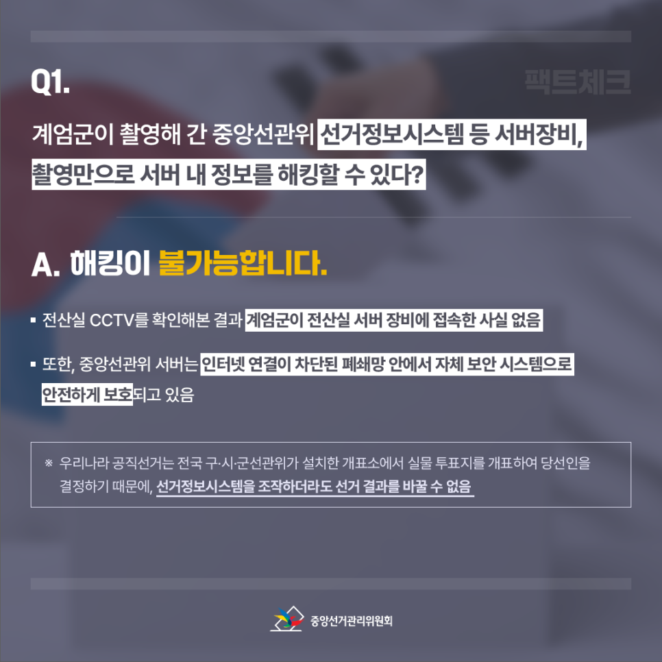 Q1. 계엄군이 촬영해 간 중앙선관위 선거정보시스템 등 서버장비, 촬영만으로 서버 내 정보를 해킹할 수 있다?