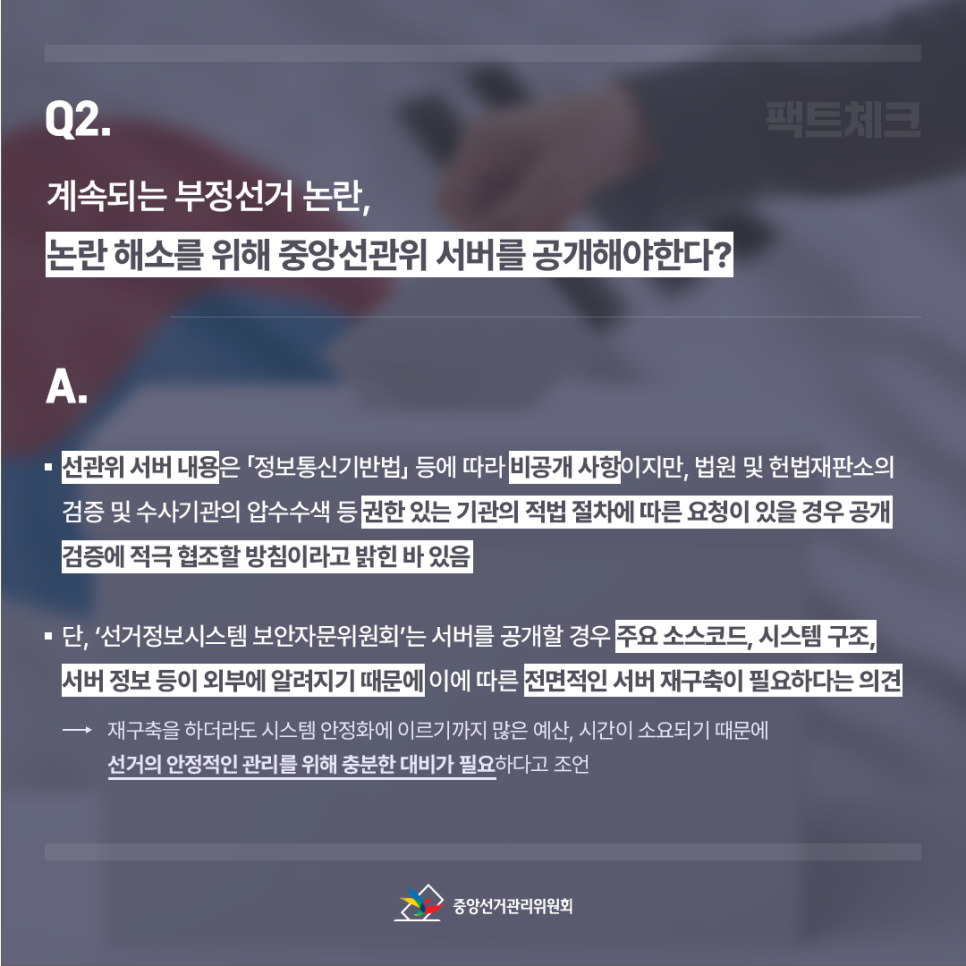 A. 선관위 서버 내용은 「정보통신기반법」 등에 따라 비공개 사항이지만, 법원 및 헌법재판소의 검증 및 수사기관의 압수수색 등 권한 있는 기관의 적법 절차에 따른 요청이 있을 경우 공개 검증에 적극 협조할 방침이라고 밝힌 바 있음