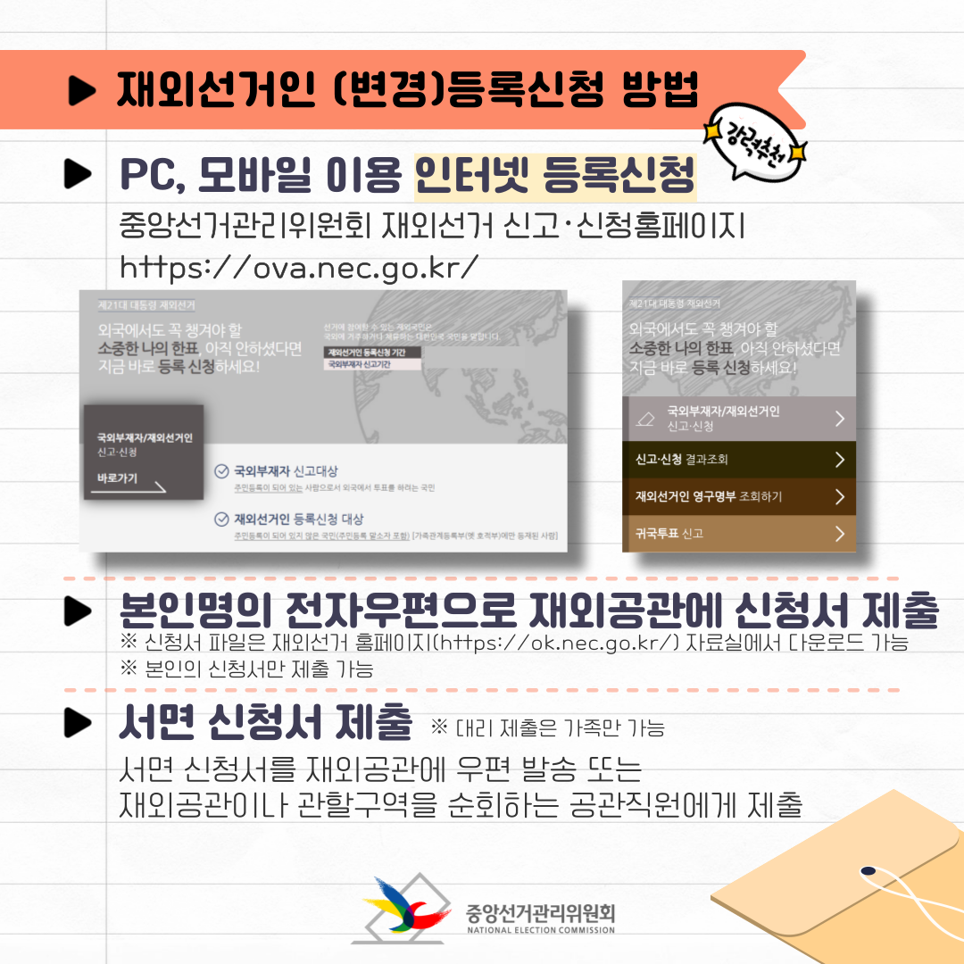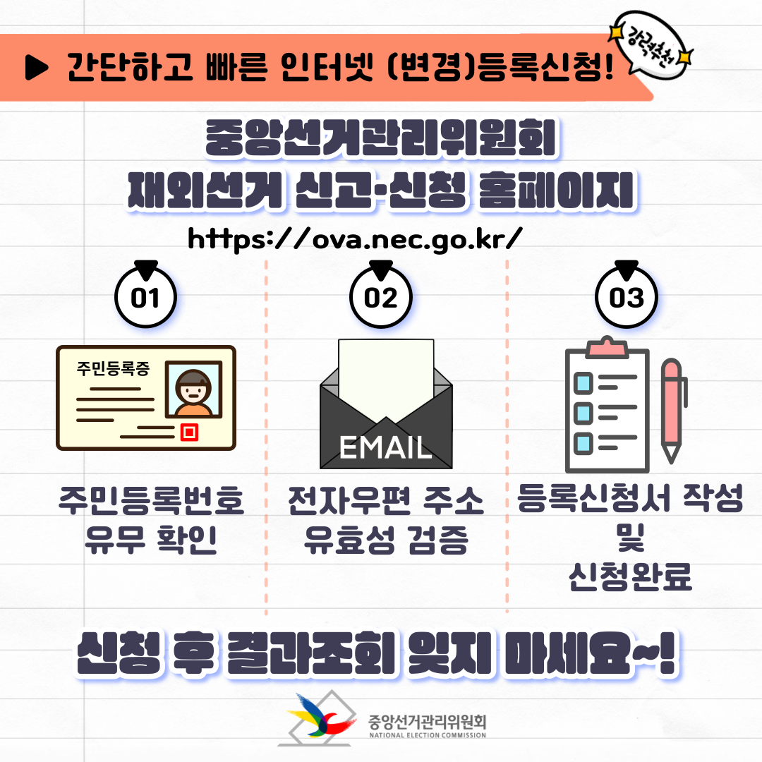 - 중앙선거관리 위원회 재외선거 신고, 신청 홈페이지 https://ova.nec.go.kr/