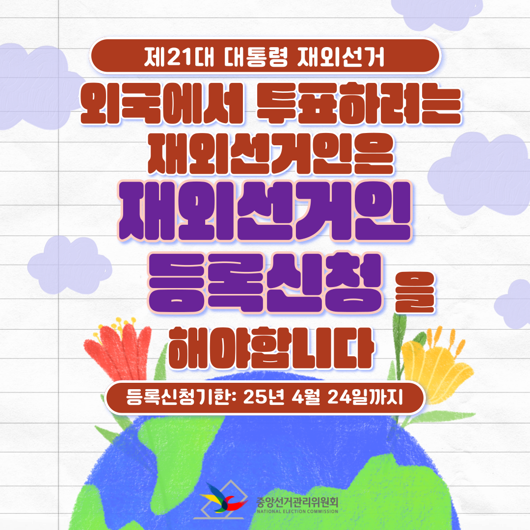 [제21대 대통령 재외선거] 외국에서 투표하여면 재외선거인 등록신청을 해야합니다.
